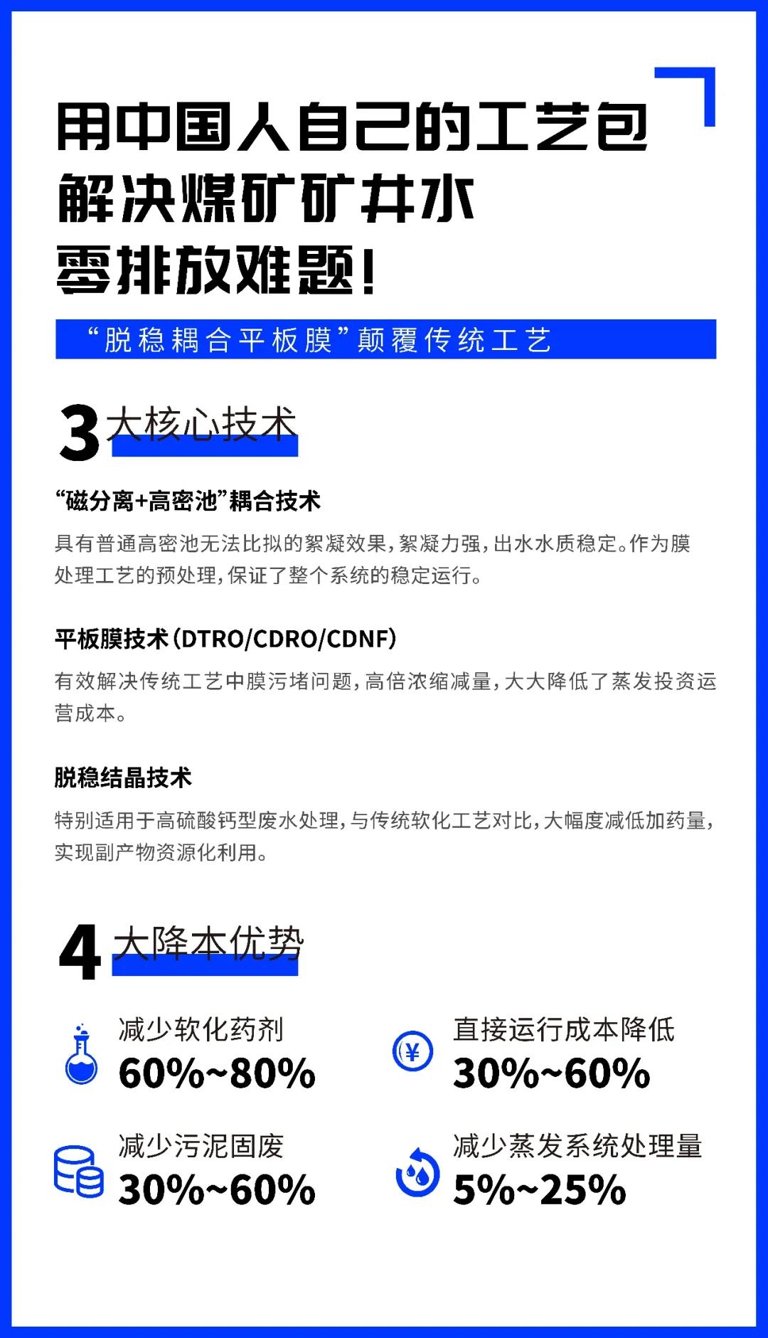 “脫穩耦合平板膜法礦井水零排放集成裝備”可廣泛應用于高硬度、高鹽(礦化度)廢水的處理。