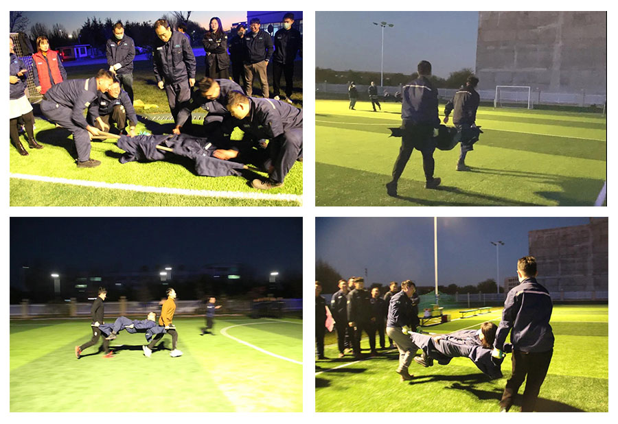 “兄弟,有我在,別怕!”公司發展歷程中始終重視“以人為本”的安全理念,時刻懷著謹慎之心,設想最不利條件下,員工是否能組織自救。本次救援演練沒有擔架,只有平常生產中常見的物料,救援人員要利用現場條件自制擔架,組織救援。